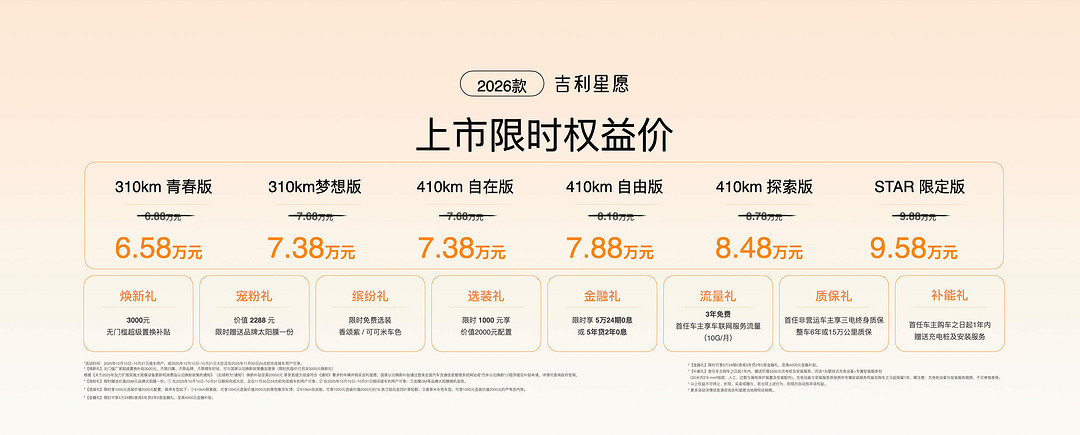 10月10日,2025吉利汽車用戶大會(huì)在杭州成功舉辦?;顒?dòng)現(xiàn)場(chǎng),2026款吉利星愿也正式宣布上市,新車共推出6個(gè)版型,限時(shí)權(quán)益售價(jià)區(qū)間為6.58萬元-9.58萬元。同時(shí),官方還推出了煥新禮、寵粉禮、繽紛禮、選裝禮等八重限時(shí)購(gòu)車權(quán)益。