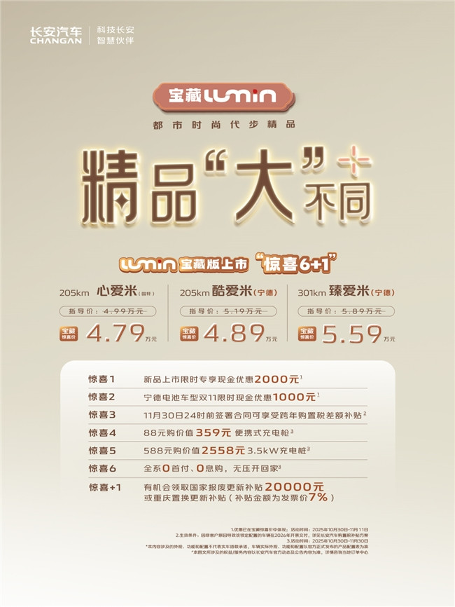 10月30日,都市時尚代步精品,Lumin寶藏版正式上市,共推出心愛米、酷愛米、臻愛米三個配置,官方驚喜價(jià)4.79萬-5.59萬。為回饋用戶,Lumin同步推出極具誠意的“驚喜6+1”大禮,購車門檻大幅降低。
