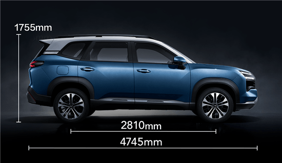 車側(cè)部分,下半部分采用黑色護(hù)板,上半部分提供有雙色車身選擇。尺寸部分,其長(zhǎng)寬高分別為4745mm*1850mm*1755mm,軸距為2810mm。