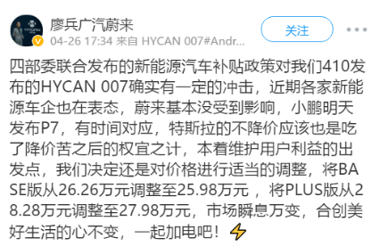 最為直爽的就是廣汽蔚來的廖兵,直接在微博宣布調(diào)價。其中,BASE版本補(bǔ)貼后售價由26.26萬元調(diào)整至25.98萬元,PLUS版本補(bǔ)貼后售價由28.28萬元調(diào)整至27.98萬元,已經(jīng)下大定的車主也可享受這一價格。至于調(diào)價的原因,廖兵提到是源于補(bǔ)貼政策的壓力。調(diào)價當(dāng)然是消費者最為喜聞樂見的事,對于僅僅發(fā)布售價半個月的HYCAN 007來說,趕在交付前進(jìn)行調(diào)價也許是對消費者負(fù)責(zé)任的表現(xiàn),不會出現(xiàn)老車主維權(quán)的情況。