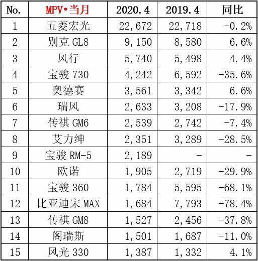 4月,五菱宏光雖有0.2%的同比降幅,但依然憑借22672輛的銷量占據(jù)MPV市場榜首的地位。