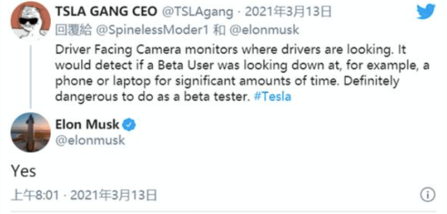 特斯拉一直以來在面對消費者意見的時候向來都是較為傲慢的態(tài)度,無論是之前的車輛失速還是剎車失靈,盡管消費者怨聲載道,但官方一直未給出合理解釋,更別談有效賠償了。在今年三月初,馬斯克在自己的推特上進(jìn)行互動,針對用戶提出的特斯拉車輛是否會通過車內(nèi)攝像頭監(jiān)控車主,馬斯克輕描淡寫的回答了一個YES,而就是這個YES,讓馬斯克接下來的一段時間內(nèi)反復(fù)解釋。