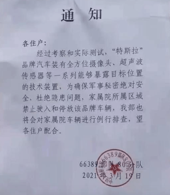 在事情發(fā)生一周后,中國某部隊發(fā)出通知,經(jīng)過實際的考察和測試,特斯拉因為車輛周圍裝了多組攝像頭,超聲波傳感器等特殊裝置,極易暴露目標(biāo)位置,為了保證軍事機(jī)密不泄露,該地區(qū)禁止特斯拉車輛駛?cè)搿?/p>