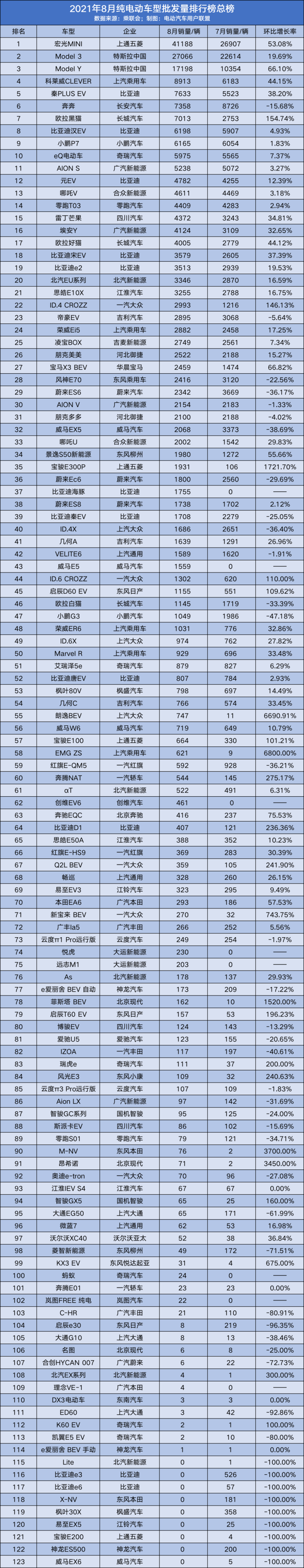 8月中國純電動(dòng)車型批發(fā)量排行榜總榜單來嘍。