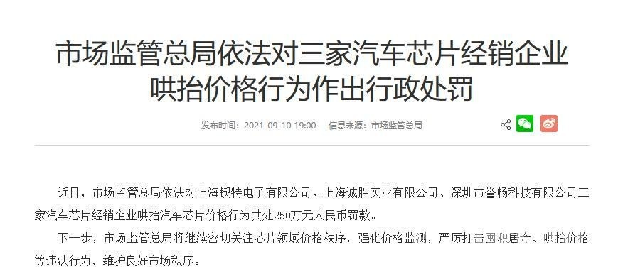 8月3日,由于汽車芯片市場(chǎng)哄抬價(jià)格、囤貨炒作等問題異常突出,國(guó)家市場(chǎng)監(jiān)管總局對(duì)相關(guān)汽車芯片經(jīng)銷商立案調(diào)查。9月10日,上海鍥特電子、上海誠(chéng)勝實(shí)業(yè)、深圳譽(yù)暢科技這三家公司,因哄抬汽車芯片價(jià)格行為被罰款250萬(wàn)元。