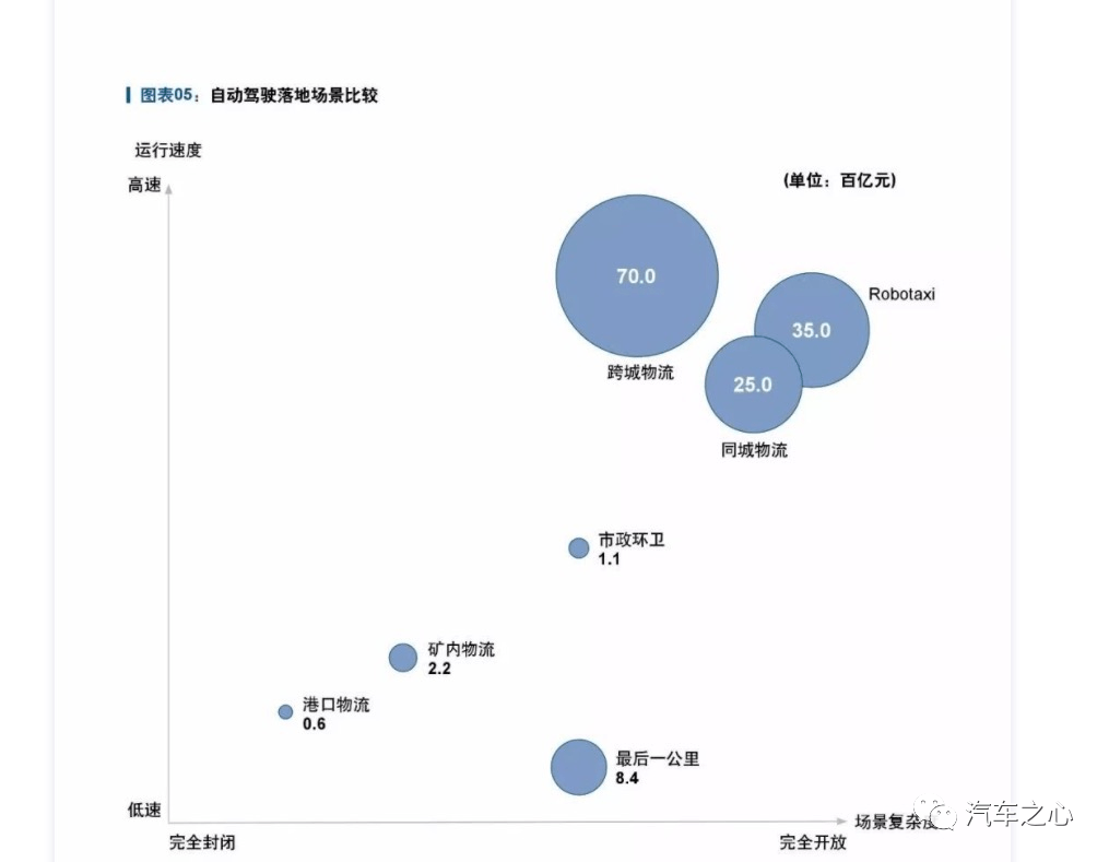 Robotaxi 無人出租車和 Robotruck 無人卡車如果實(shí)現(xiàn)對現(xiàn)有有人駕駛的替代,那市場規(guī)模都是萬億級別;同城貨運(yùn)的市場規(guī)模比 Robotaxi 和 Robotruck 略小,但也是數(shù)千億級別。根據(jù)羅蘭貝格的報(bào)告顯示,自動駕駛同城物流配送的市場規(guī)模將在 2500 億元。