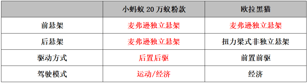 相比之下,歐拉黑貓前懸架采用了與小螞蟻相同的麥弗遜獨(dú)立懸架,但其后懸架采用了扭力梁非獨(dú)立懸架,驅(qū)動(dòng)方式采用了最為普通的前置前驅(qū),且駕駛模式也僅有“經(jīng)濟(jì)模式”一種。從這三項(xiàng)就能夠明顯看出,歐拉黑貓的“靈活”程度遠(yuǎn)不及奇瑞小螞蟻。