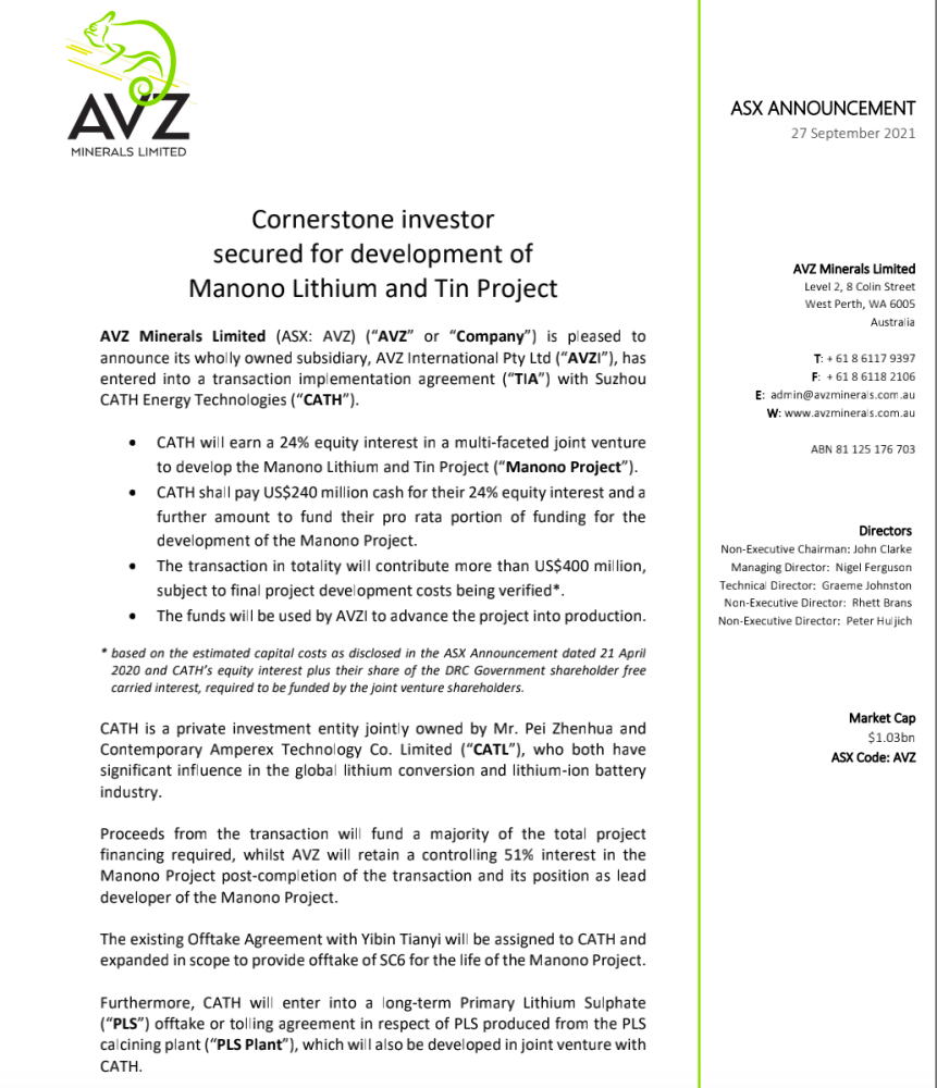 根據(jù)澎湃新聞9月27日?qǐng)?bào)道,澳大利亞礦產(chǎn)勘探公司AVZ Minerals宣布,該公司已經(jīng)與中企蘇州天華時(shí)代新能源產(chǎn)業(yè)投資公司達(dá)成協(xié)議,獲得天華時(shí)代2.4億美元的注資后,將用于開(kāi)發(fā)位于剛果(金)的鋰項(xiàng)目Manono,屆時(shí)天華時(shí)代將獲得該項(xiàng)目公司24%股權(quán)。AVZ透露,在開(kāi)發(fā)成本核實(shí)后,寧德時(shí)代提供的資金將超4億美元(約合人民幣25.8億元)。此外,兩家公司或?qū)⒗^續(xù)合作,評(píng)估開(kāi)發(fā)氫氧化鋰設(shè)施的可行性。寧德時(shí)代相關(guān)負(fù)責(zé)人向澎湃新聞表示,蘇州天華時(shí)代新能源產(chǎn)業(yè)投資公司為寧德時(shí)代的參股公司,并非其子公司。