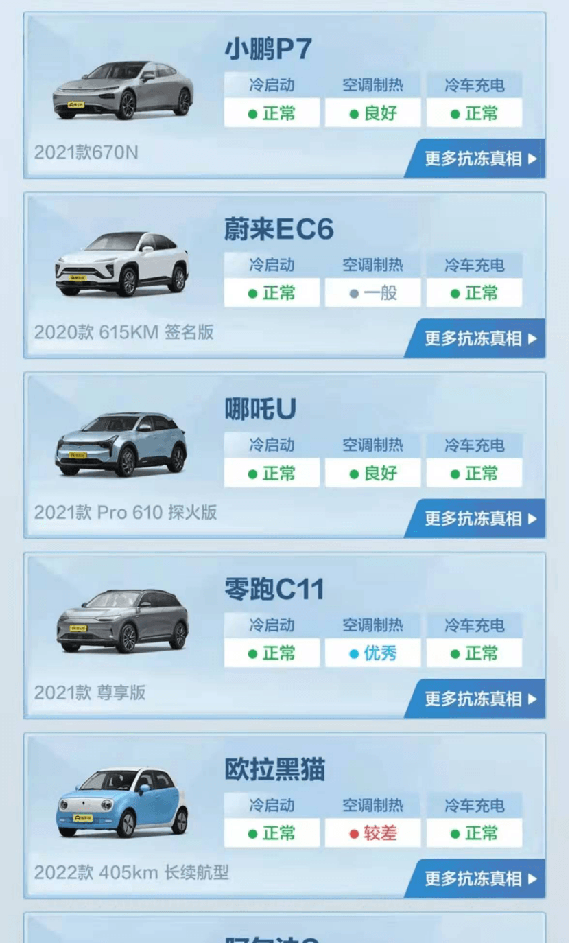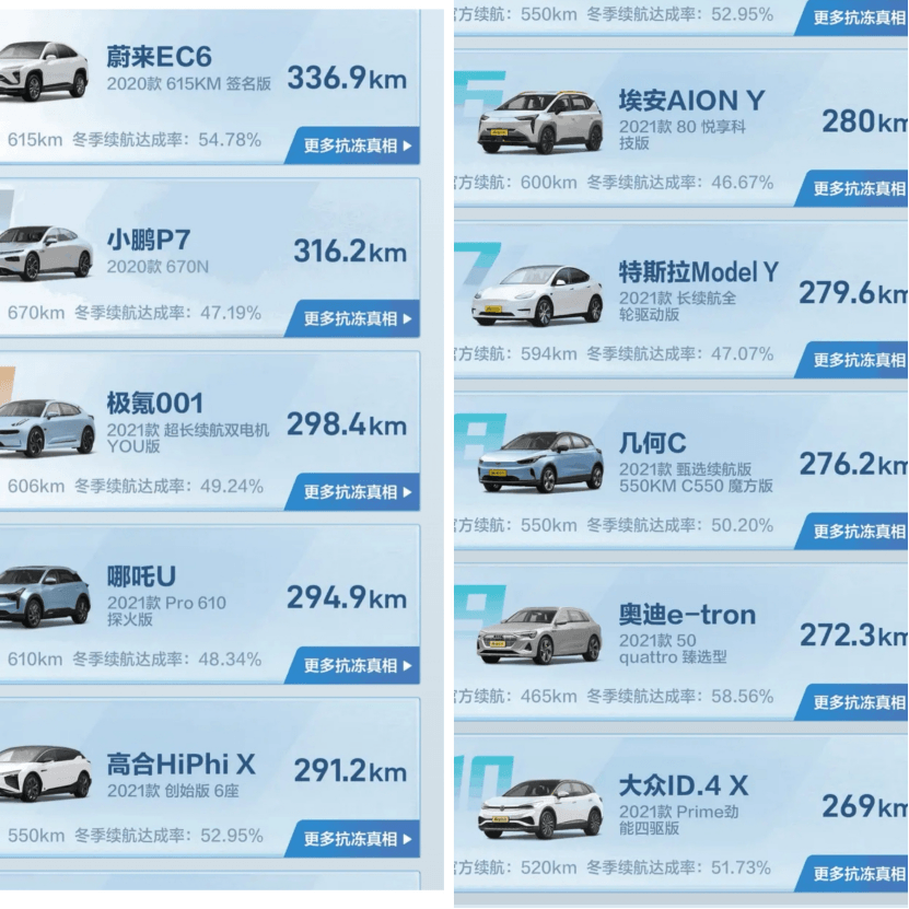 測(cè)試結(jié)果出來(lái),低溫實(shí)測(cè)續(xù)航里程前十的車型分別是蔚來(lái)EC6、小鵬P7、極氪001、哪吒U、高合HiPhi X、廣汽Aion Y、特斯拉Model Y、吉利幾何C、奧迪e-tron、大眾ID.4X。值得一提的是,前十的車型當(dāng)中其中有7臺(tái)是自主品牌。