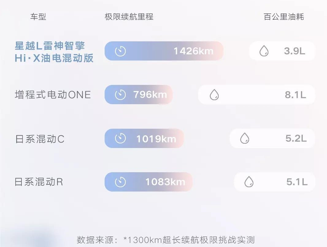 搭載了雷神智擎Hi·X混動系統(tǒng)的吉利星越L,集成了燃油發(fā)動機和3擋DHT Pro電動機,系統(tǒng)綜合功率為180kW,系統(tǒng)綜合扭矩達540N·m。在近日舉行的超長續(xù)航公開挑戰(zhàn)測試中,多家媒體對星越L混動版進行續(xù)航測試的結(jié)果都達到了1300km,最極限的續(xù)航里程為1426km。
