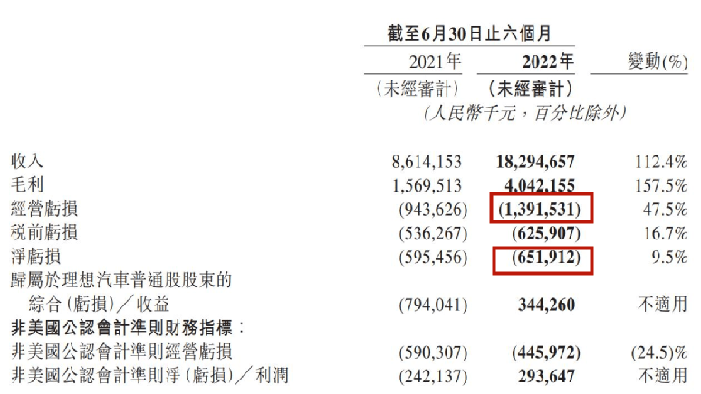 截至2022年二季度,理想的經(jīng)營虧損累計達(dá)9.7億元,歸屬股東凈虧損累計達(dá)6.5億元,均處于同期歷史高位。