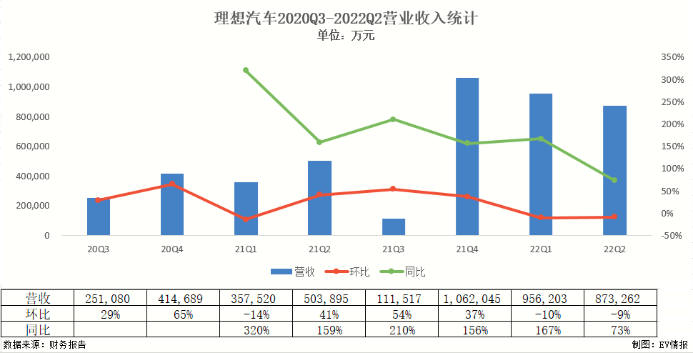 首先是營業(yè)收入方面,理想汽車二季度營業(yè)收入87.3億元,同比增長73.3%,較一季度環(huán)比下降8.7%。