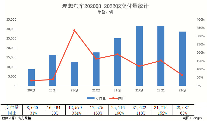 其中車輛銷售作為收入的主要來源,理想汽車二季度車輛銷售收入為84.8億元,同比增長73%;但受到疫情影響,較一季度環(huán)比下降8.9%,這在交付量上也得以體現(xiàn)。