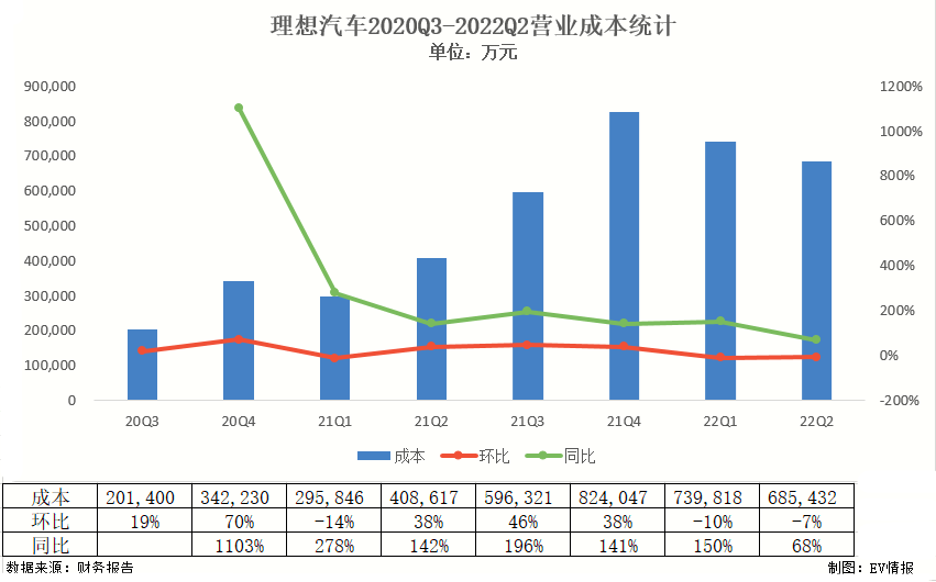 首先是成本方面,理想汽車二季度成本為68.5億元,同比增長67.7%,較一季度環(huán)比下降7.4%。
