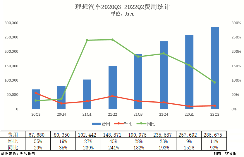 其次是費(fèi)用方面,理想汽車二季度費(fèi)用為28.6億元,同比增長91.9%,環(huán)比增長10.9%。