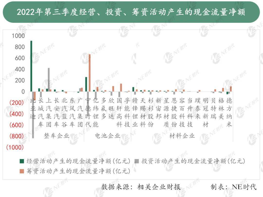 經營活動來看,整車企業(yè)中的比亞迪、電池企業(yè)中的寧德時代、材料企業(yè)中的贛鋒鋰業(yè),依靠經營活動創(chuàng)造了強現(xiàn)金流凈額,投資活動基本上都是支出項,但是上汽集團三季度末依靠投資及處置固定資產、無形資產及其他項目取得424.28億元凈額?;I資活動中,寧德時代2020年第三季度籌資凈額668.73億元,外部投資468.28億元,其中子公司吸收少數股東投資收到的現(xiàn)金19.63億元。