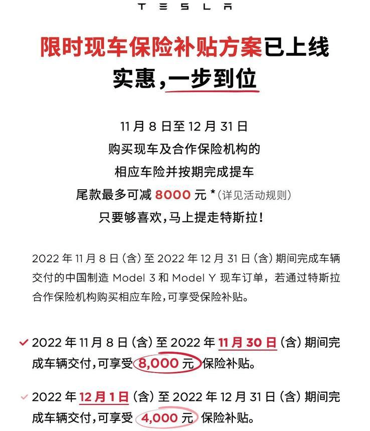 然而特斯拉在降價之后還不滿足,近日又來了一波限時補(bǔ)貼。凡是購買現(xiàn)車+選擇合作保險機(jī)構(gòu)的消費者,在11月份提車可享受8000元保險補(bǔ)貼,12月提車可享受4000元補(bǔ)貼。特斯拉這一波像極了年終大促,目的嘛大概率就是為了沖擊交付量。