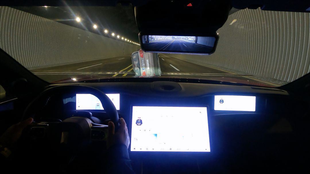 我們來看一下阿維塔11的表現(xiàn),過彎道之后,以時(shí)速接近60的速度,進(jìn)隧道口,剎住了。
