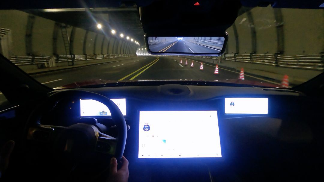 第二個(gè)場(chǎng)景是隧道內(nèi)有一排連續(xù)的錐筒,相當(dāng)于模擬一個(gè)施工場(chǎng)景,看車輛能否識(shí)別并自動(dòng)變道;