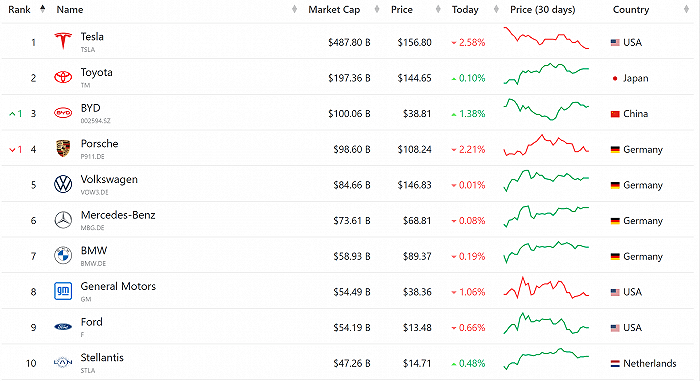 12月14日,特斯拉股價收于156.80美元,下跌2.6%,市值為4950億美元,是自2020年1月以來首次特斯拉市值跌破5000億美元。雖然目前特斯拉市值在5000億美元以下,但仍位居全球車企市值第一的位置。連豐田、大眾、奔馳、寶馬等傳統(tǒng)車企大廠,都被其遠(yuǎn)遠(yuǎn)甩在了后頭。