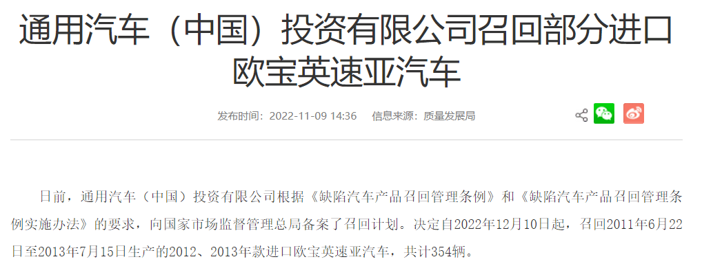 雖然通用這次大規(guī)模召回并不是在國內(nèi),但從國家市場監(jiān)督管理局網(wǎng)站了解到,今年11月份,通用汽車發(fā)起召回部分進(jìn)口歐寶英速亞汽車的消息。信息顯示,自2022年12月10日起,召回2011年6月22日至2013年7月15日生產(chǎn)的2012、2013年款進(jìn)口歐寶英速亞汽車,共計(jì)354輛。召回原因是范圍內(nèi)車輛的后懸架橫拉桿可能因腐蝕而斷裂,影響車輛的駕駛穩(wěn)定性,發(fā)生事故的風(fēng)險(xiǎn)增加,存在安全隱患。通用汽車也將為召回的車輛免費(fèi)更換左、右兩側(cè)的后懸架橫拉桿,以消除安全隱患。
