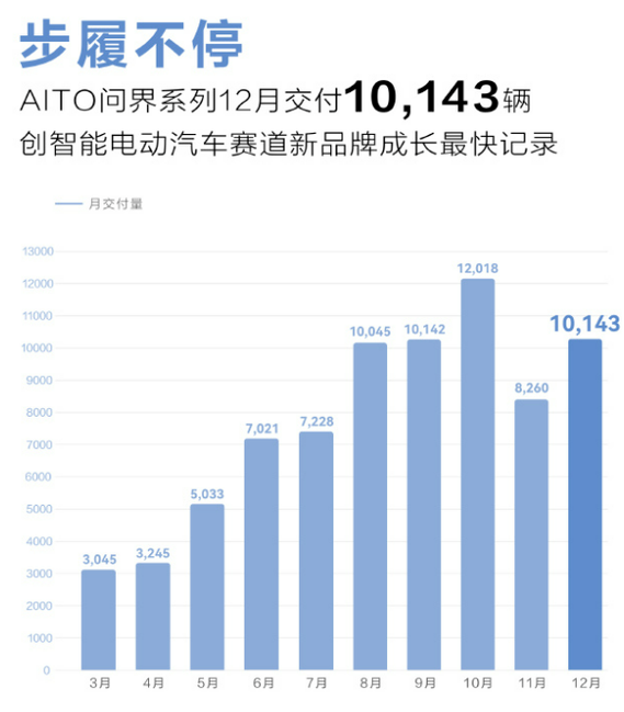 問界系列12月交付量達(dá)到10,143輛,再次實(shí)現(xiàn)單月交付破萬。自3月以來,AITO問界系列已經(jīng)實(shí)現(xiàn)累計(jì)交付超過7.5萬輛。