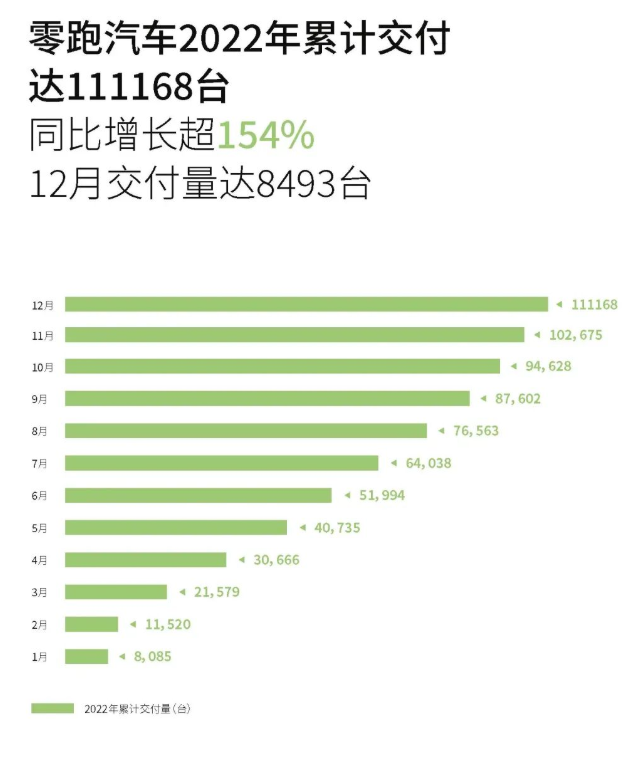 零跑汽車12月交付新車8,493輛,環(huán)比增長5.54%;2022年累計(jì)交付新車111,168輛,同比增長超154%。