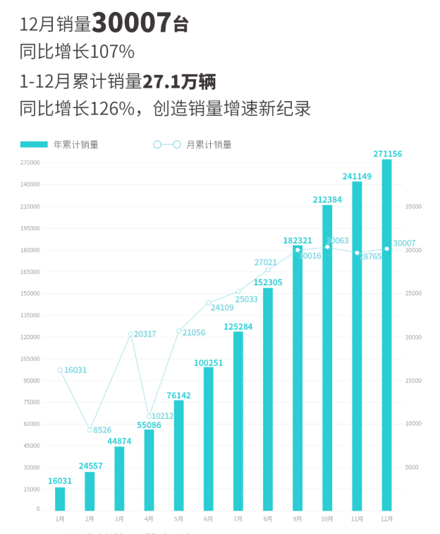 數(shù)據(jù)顯示,廣汽埃安2022年12月交付新車30,007輛,同比增長107%,1-12月累計(jì)交付27.1萬輛,同比增長126%。