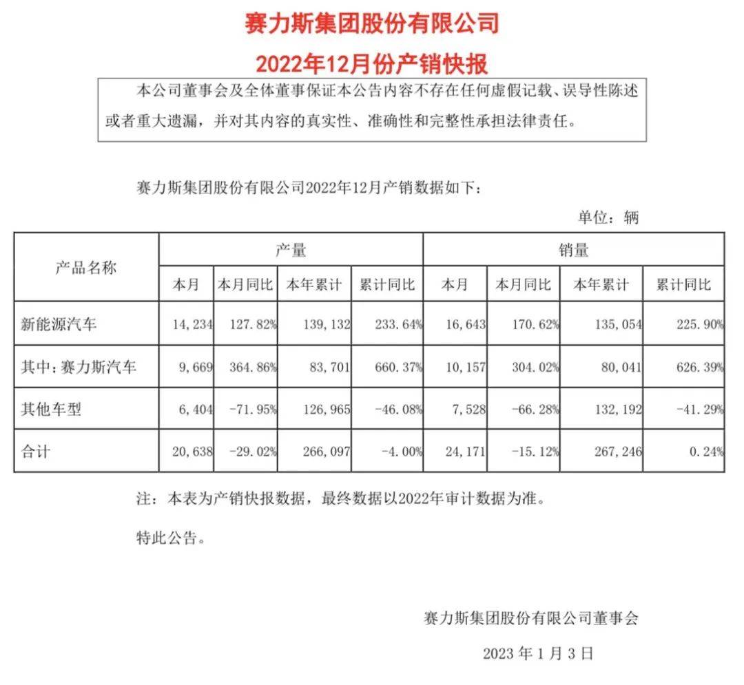 賽力斯公告,公司2022年12月新能源汽車銷量16,643輛,同比增長170.62%。其中:賽力斯汽車銷量10,157輛,同比增長304.02%。