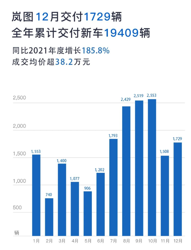 2022年12月嵐圖交付新車1,729輛,環(huán)比增長14.7%;2022年1月至12月嵐圖累計(jì)交付新車19,409輛,單車均價(jià)超38.2萬元。
