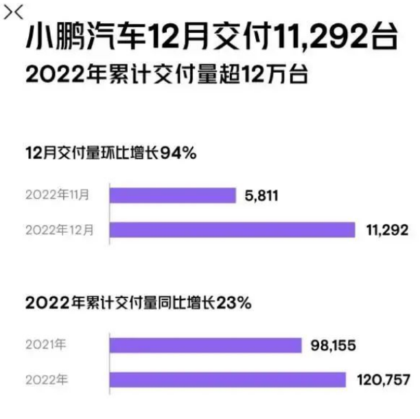 2022年12月,小鵬汽車總交付11,292輛,環(huán)比增長94%。其中,G9首次突破4千臺,達(dá)4,020臺,環(huán)比增長160%。