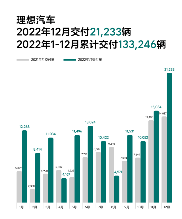2022年12月,理想汽車共交付新車21,233輛,創(chuàng)單月最高交付紀(jì)錄,同比增長50.7%。第四季度累計(jì)交付46,319輛,同比2021年第四季度增長31.5%。2022年1月至12月,理想汽車總計(jì)交付133,246輛,同比2021年增長47.2%。截止到2022年12月31日,理想汽車?yán)塾?jì)交付量為257,334輛。