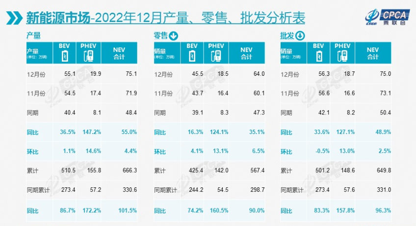 乘聯(lián)會數(shù)據(jù)顯示,2022年12月新能源乘用車零售銷量達(dá)到64.0萬輛,同比增長35.1%,環(huán)比增6.5%;1-12月新能源乘用車國內(nèi)零售567.4萬輛,同比增長90.0%。12月,自主品牌中的新能源車滲透率51.0%;豪華車中的新能源車滲透率22.8%。12月主流自主品牌新能源車零售份額70.6%;合資品牌新能源車份額6.5%。