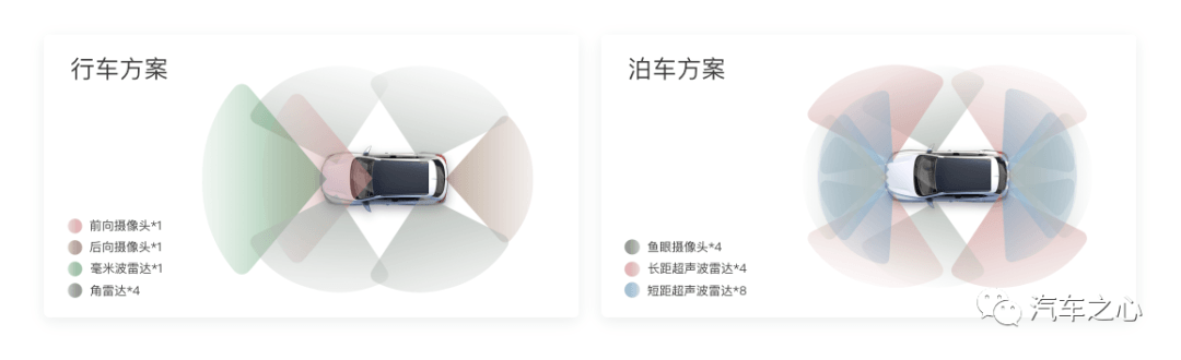 而在泊車過程中,該方案也能夠憑借 4 個(gè)魚眼攝像頭和 8 個(gè)短距離超聲波雷達(dá)、4 個(gè)長距超聲波雷達(dá),實(shí)現(xiàn)對(duì)停車環(huán)境的感知,以保證停車安全。