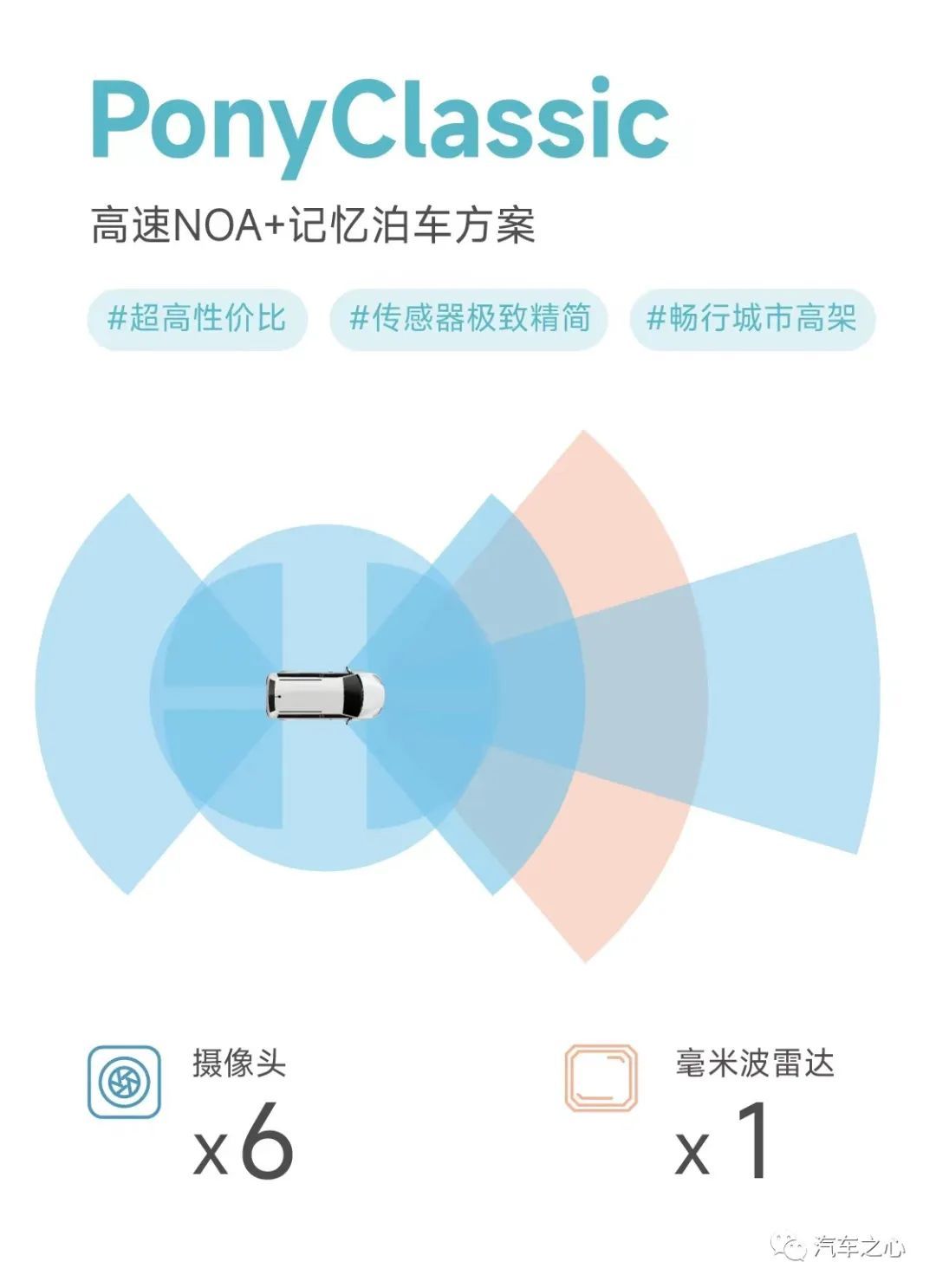 以其 PonyClassic 系統(tǒng)級方案為例,僅用低至數(shù)千元的硬件成本,可實現(xiàn)「高速 NOA+記憶泊車」功能。
