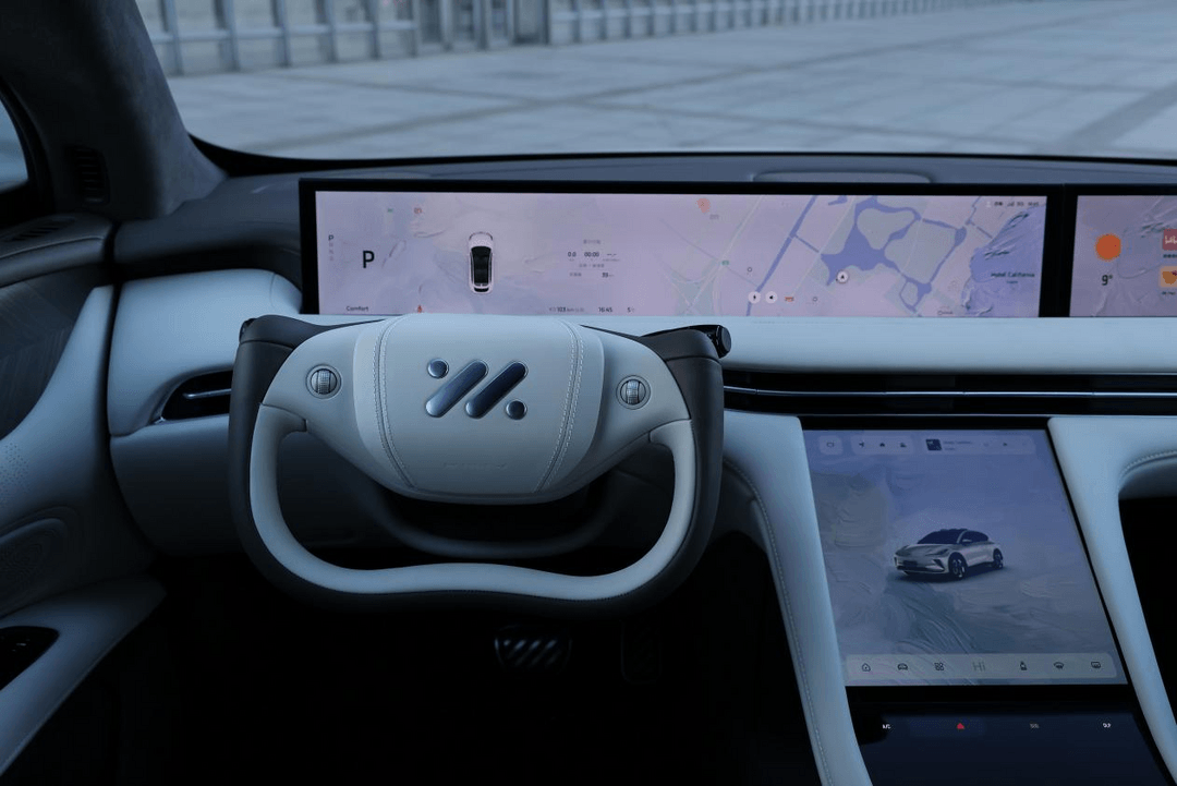 智己LS7定位于中大型SUV,采用家族化設(shè)計(jì)語言,軸距可達(dá)3060mm,在大五座的布局之下,能夠?yàn)橛脩籼峁挸ǘ朱`活的后排乘坐空間。與此同時(shí),這款車還采用了超大尺寸的前擋風(fēng)玻璃以及相當(dāng)個(gè)性的半幅式方向盤,三聯(lián)屏設(shè)計(jì)的大屏也有比較強(qiáng)的科技感。
