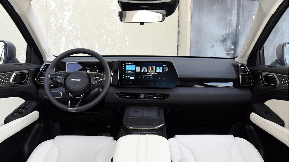 走進(jìn)梟龍車內(nèi),同樣能察覺到簡潔之美,T字形的方向盤帶給人極強(qiáng)的運(yùn)動感,恰到好處的皮質(zhì)包裹,營造出不俗的高級質(zhì)感。車內(nèi)使用了12.3英寸的中控大屏幕+7英寸的液晶屏幕的組合,未搭載任何的車載系統(tǒng),使得車機(jī)整體操作體驗(yàn)較為一般。