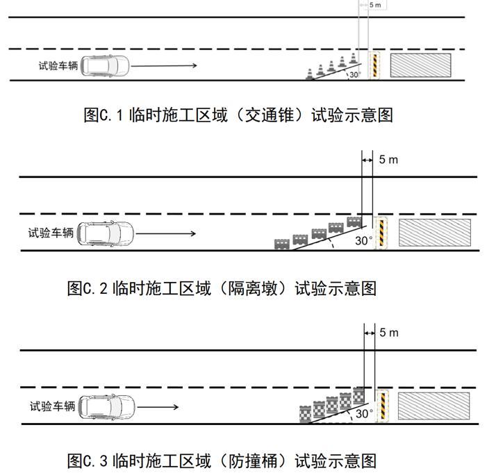 施工區(qū)域探測與響應試驗:在高速道路環(huán)境下,領(lǐng)航組合駕駛輔助系統(tǒng)需要通過施工區(qū)域探測與響應能力試驗,試驗車輛前進方向有成排交通錐封路,試驗車輛對向車道的內(nèi)側(cè)車道由活動護欄隔離封路且延伸至對向車道內(nèi)側(cè)車道的外側(cè)車道邊線,試驗車輛需要識別并避免與交通錐發(fā)生碰撞。