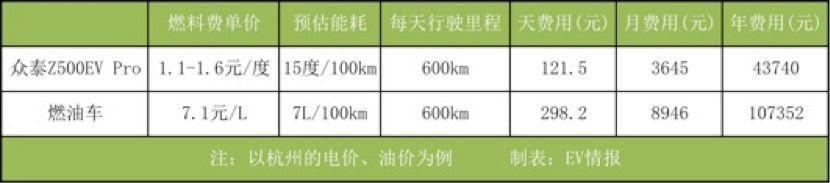 據(jù)悉,眾泰Z500EV Pro百公里能耗約15度電,以杭州為例,參考其波峰電價1.6元/千瓦時,波谷電價1.1元/千瓦時,按每天600公里,波峰波谷分別充電一次,一天的電費為121.5元,一個月電費只需要3645元。