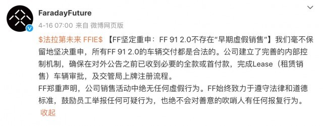 FF官微16日表示,公司銷售活動中絕無任何虛假行為,所有FF 91 2.0的車輛交付都是合法的。公司建立了完善的內(nèi)部控制機(jī)制,確保在對外公告之前已收到必要的全款或首付款,完成Lease(租賃銷售)車輛審批,及交管局上牌注冊流程。