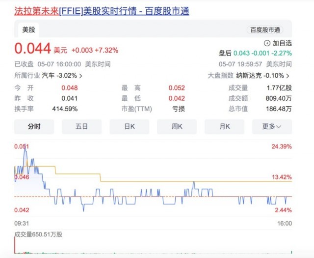 截至美東時間5月7日收盤,F(xiàn)F(NASDAQ:FFIE)股價上漲7.32%,報0.044美元,總市值186.48萬美元。盤后,F(xiàn)F股價下跌,截至發(fā)稿,F(xiàn)F股價報0.043美元,下跌2.27%。
