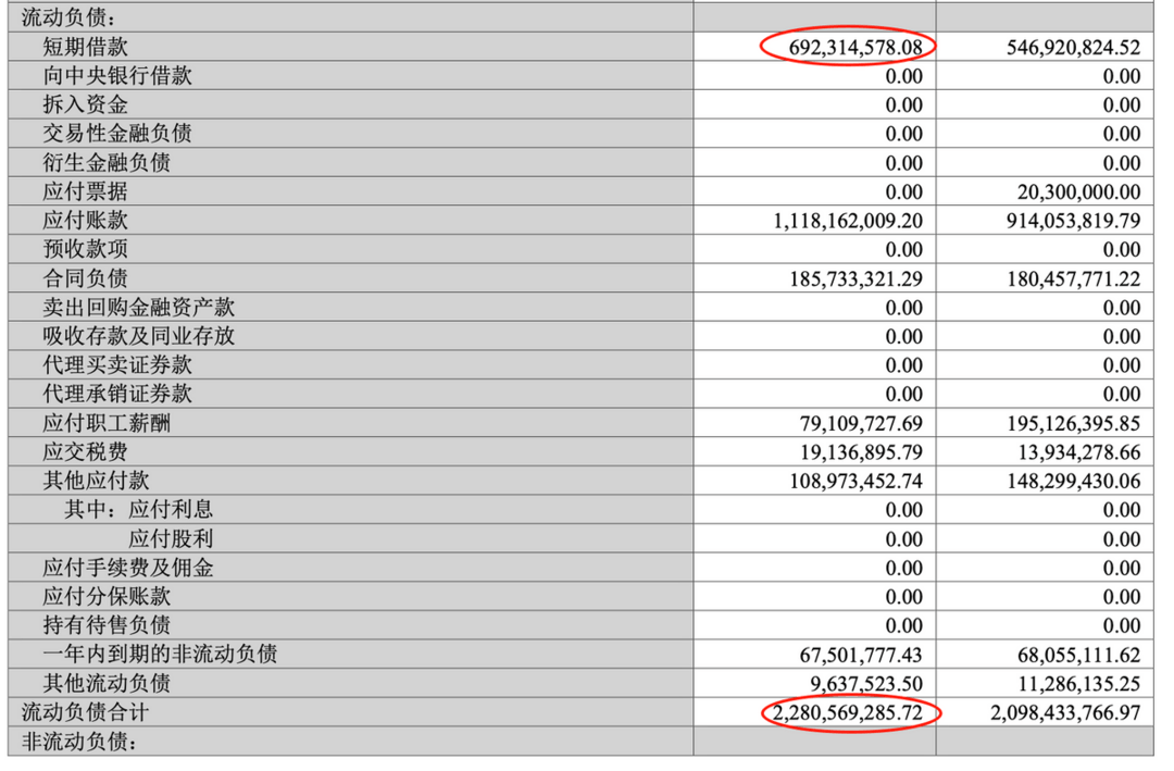更棘手的是現(xiàn)金流狀況:經(jīng)營(yíng)活動(dòng)現(xiàn)金流凈額-2.5億元,同比驟降283.73%,貨幣資金較年初減少10.54%至23.05億元,而短期借款6.92億較去年同期激增243.26%,流動(dòng)負(fù)債占比已達(dá)92.84%。