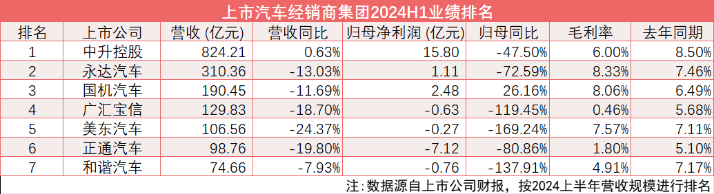 流通協(xié)會的監(jiān)測數(shù)據(jù)顯示,今年前8個月,新車市場整體零售累計損失1380億元,經銷商進銷倒掛數(shù)據(jù)最高達到-22.8%。2024年上半年,僅有35.4%的經銷商實現(xiàn)盈利,虧損經銷商比例達50.8%。多家大型汽車經銷商集團股價大幅下跌,部分甚至面臨退市風險。