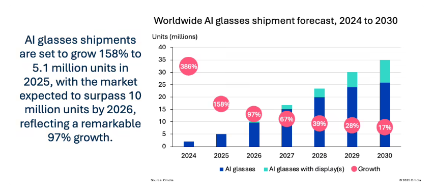 IT之家9月28日消息,據(jù)機(jī)構(gòu)OMDIA預(yù)測(cè),AI眼鏡市場(chǎng)正迎來快速增長(zhǎng)期。在