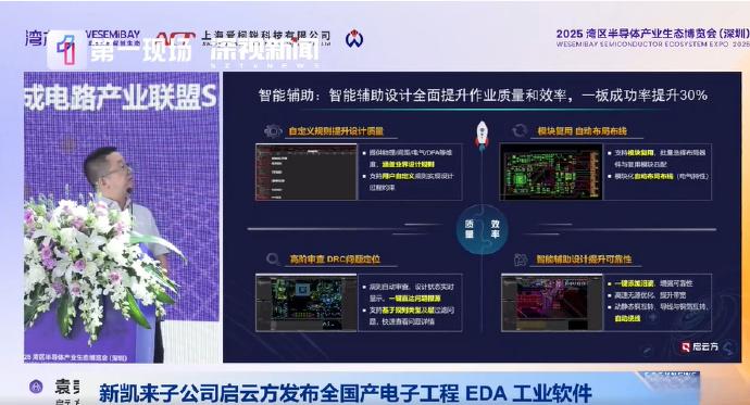 10月15日消息,新凱來子公司啟云方在深圳舉辦的2025灣區(qū)半導(dǎo)體產(chǎn)業(yè)生態(tài)博覽會(huì)(灣芯展)上,發(fā)布了兩款擁有完全自主知識(shí)產(chǎn)權(quán)的國產(chǎn)電子工程EDA設(shè)計(jì)軟件。此次發(fā)布的軟件為原理圖和PCB設(shè)計(jì)工具,在電子電路設(shè)計(jì)的多項(xiàng)關(guān)鍵指標(biāo)上已達(dá)到業(yè)界一流水平。據(jù)介紹,該軟件性能較行業(yè)標(biāo)桿提升30%,并能將硬件開發(fā)周期縮短40%。
