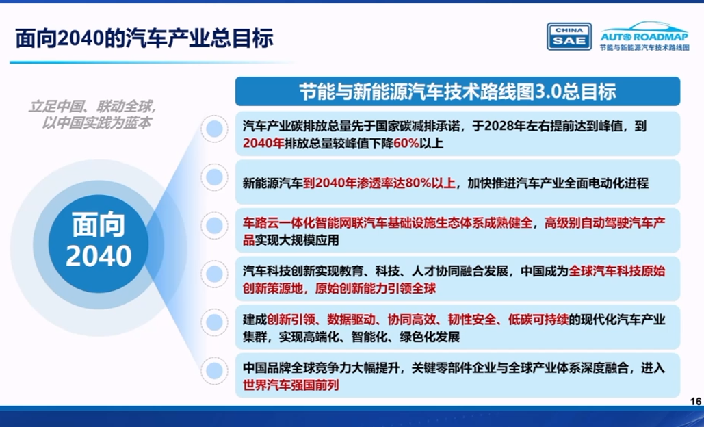 10月23日,中國(guó)汽車(chē)工程學(xué)會(huì)發(fā)布《節(jié)能與新能源汽車(chē)技術(shù)路線圖3.0》。該路線圖重點(diǎn)圍繞節(jié)能汽車(chē)可持續(xù)發(fā)展、新能源汽車(chē)迭代升級(jí)、智能網(wǎng)聯(lián)汽車(chē)演進(jìn)等核心方向展開(kāi),更加突出全球化視野,將我國(guó)汽車(chē)產(chǎn)業(yè)發(fā)展放在全球汽車(chē)產(chǎn)業(yè)變革大背景下謀劃。路線圖3.0提出了面向2040年我國(guó)汽車(chē)產(chǎn)業(yè)的發(fā)展目標(biāo),包括提前實(shí)現(xiàn)碳排放達(dá)峰、提升新能源汽車(chē)滲透率、推動(dòng)智能網(wǎng)聯(lián)汽車(chē)普及等。