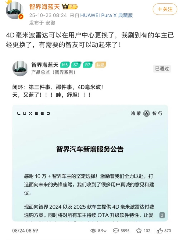 10月23日,鴻蒙智行智界品牌宣布,針對(duì)2024及2025款車(chē)型推出的4D毫米波雷達(dá)付費(fèi)選購(gòu)方案已啟動(dòng)用戶(hù)中心更換服務(wù)。智界產(chǎn)品總監(jiān)@智界海藍(lán)天發(fā)微博稱(chēng),4D毫米波雷達(dá)可以在用戶(hù)中心更換,無(wú)需車(chē)輛返廠(chǎng)操作,用戶(hù)中心就可以進(jìn)行雷達(dá)更換。此次升級(jí)覆蓋三款核心車(chē)型,分別是智界S7 Max及以上版本、智界R7純電Max及以上版本、智界R7增程Max版本,升級(jí)定價(jià)對(duì)應(yīng)為4999元和5079元。升級(jí)服務(wù)將于9月30日根據(jù)登記日期提供。