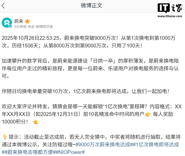 10月26日,蔚來汽車宣布其換電服務(wù)已突破9000萬次,日均換電單量超過10萬次。從第1次換電到第1000萬次,蔚來用了1506天,而從第8000萬次到第9000萬次僅用了100天。蔚來的用戶換電電量累計達到47.5億kWh,相當于為超過237萬家庭提供一年的用電量。目前,蔚來在全國范圍內(nèi)擁有8307座充換電站,其中1002座高速公路換電站,覆蓋全國550個城市,形成了9縱11橫16大城市群的高速換電網(wǎng)絡(luò)。