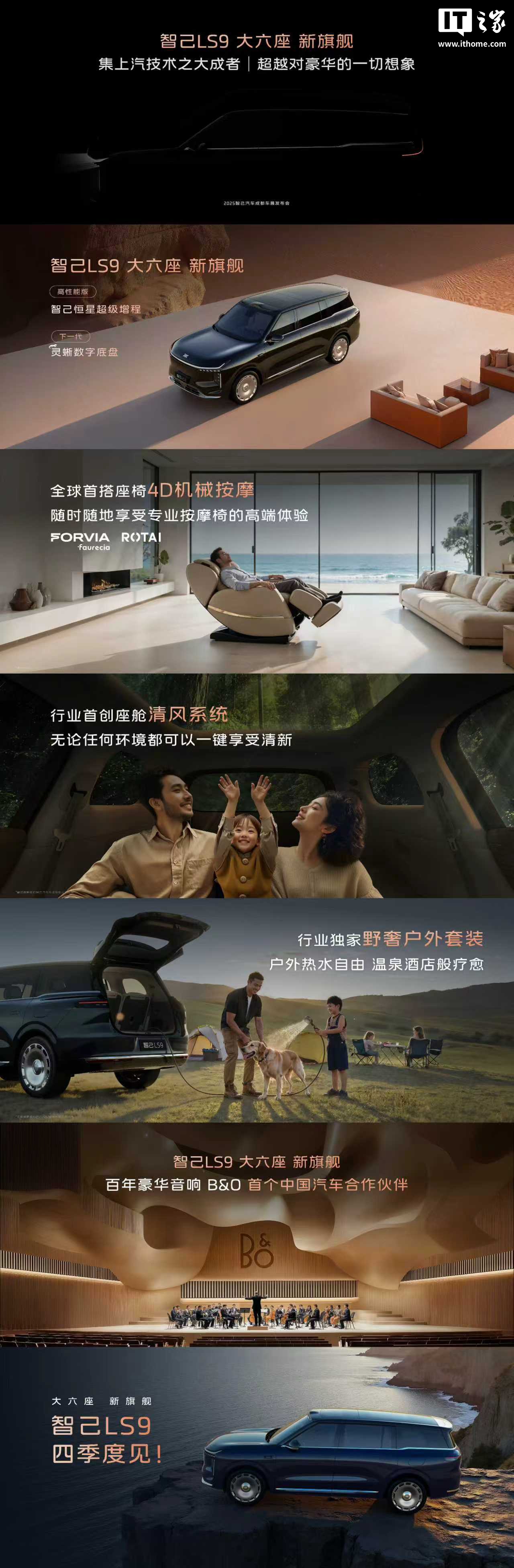 智己LS9的車身尺寸為5279/2000/1806mm,軸距3160mm,整備質(zhì)量2695kg,總質(zhì)量3205kg。車輛提供多種選裝件,包括車頂前照燈、露營燈、激光雷達,強調(diào)戶外露營用車場景,以及多款輪轂和半幅方向盤的內(nèi)飾選擇。動力方面,智己LS9搭載上汽的1.5L增程器,最大功率114kW,配備峰值功率160kW/230kW的雙電機系統(tǒng),