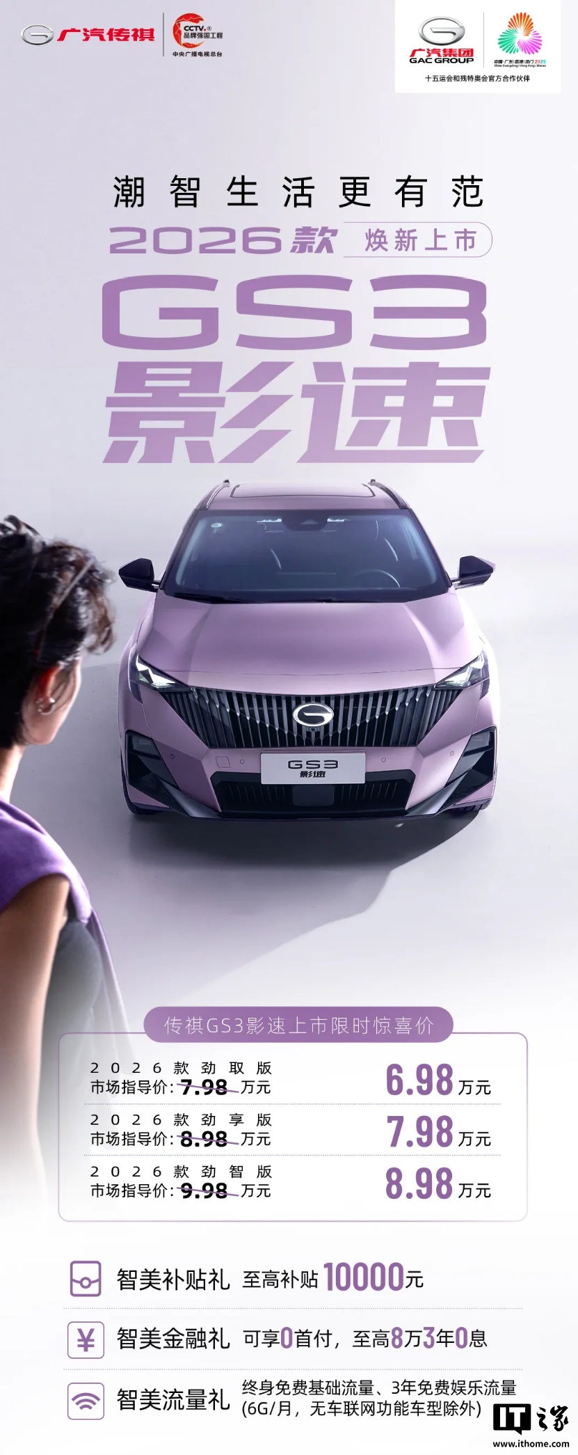 10月27日,2026款廣汽傳祺GS3影速汽車正式上市,帶來限時(shí)驚喜價(jià)6.98萬元起。新車提供勁取版、勁享版和勁智版三個(gè)配置,市場(chǎng)指導(dǎo)價(jià)分別為7.98萬元、8.98萬元和9.98萬元,限時(shí)優(yōu)惠后價(jià)格分別為6.98萬元、7.98萬元和8.98萬元。首發(fā)購車用戶可享至高1萬元
